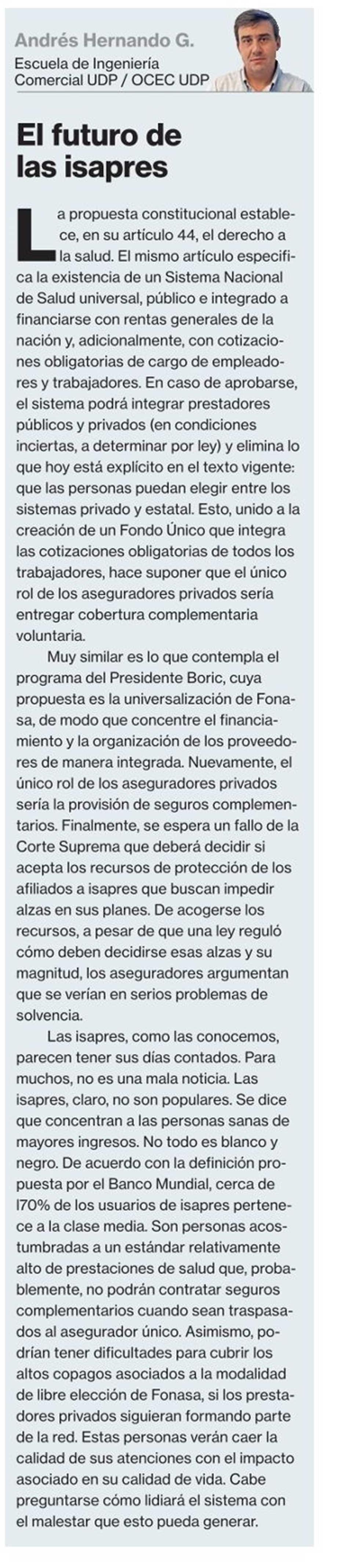 “Según una definición propuesta por el Banco Mundial, cerca de 170% de usuarios de isapres pertenece a la clase media. Son personas acostumbradas a un estándar relativamente alto de prestaciones de salud que, probablemente, no podrán contratar seguros complementarios cuando sean traspasados al asegurador único”.