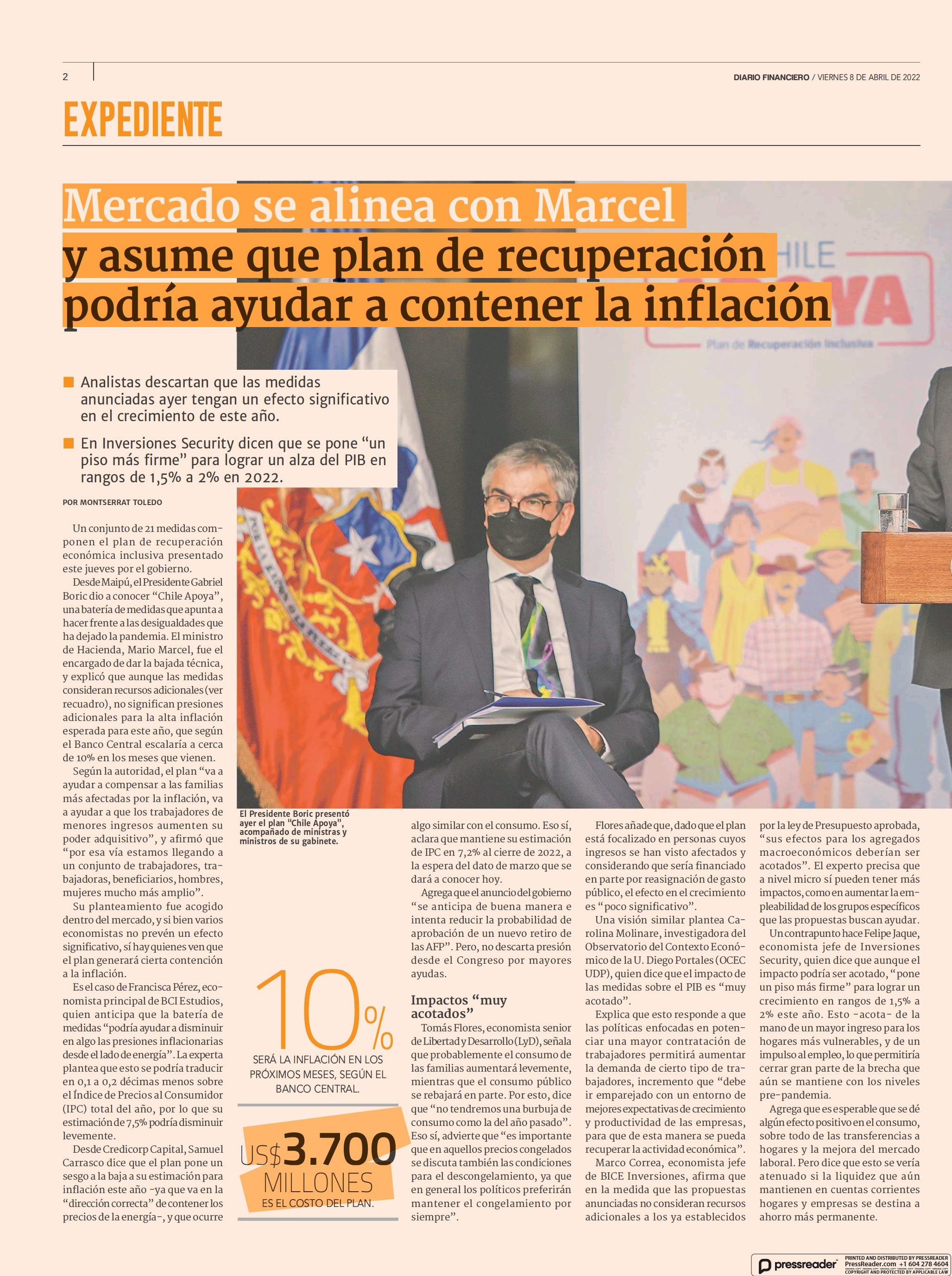 Mercado se alinea con Marcel y asume que plan de recuperación podría ayudar a contener la inflación