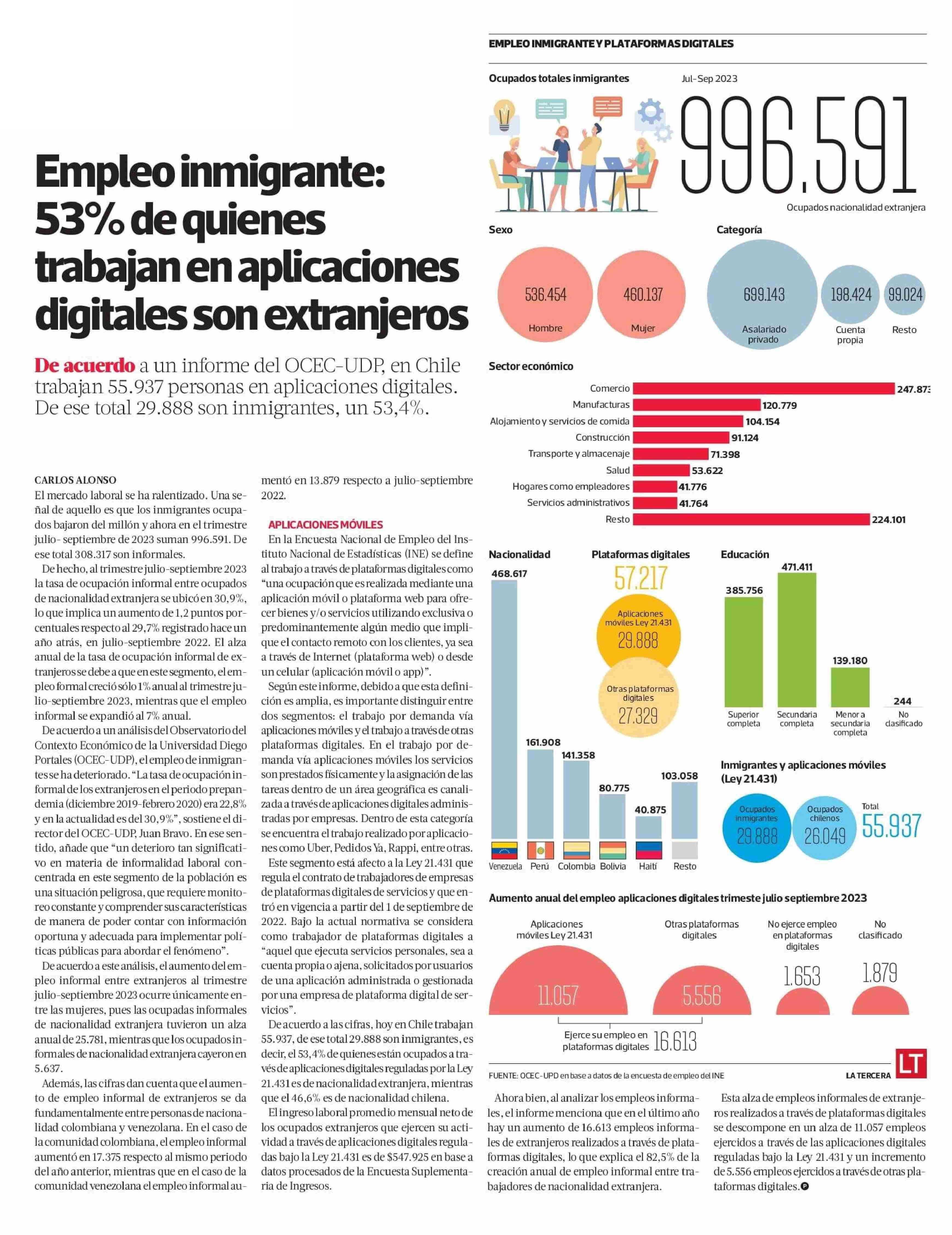 El Observatorio del Contexto Económico de la Universidad Diego Portales (OCEC UDP) dio a conocer su Enfoque Laboral Nº34, titulado “Aumento de empleo informal en la población de nacionalidad extranjera se concentra entre quienes ejercen su empleo a través de plataformas digitales”.
