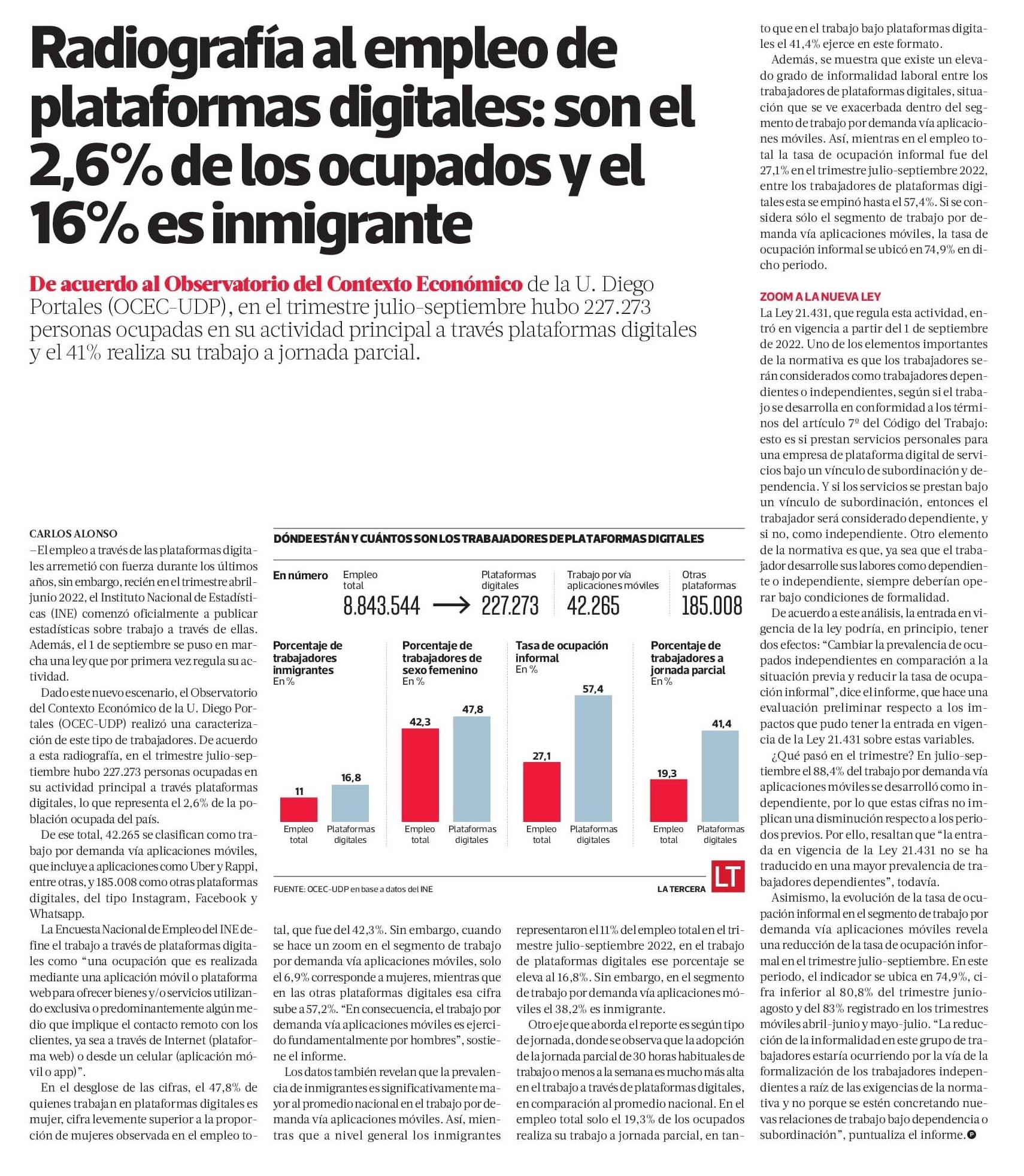 El documento, que fue recogido por una nota de Pulso de La Tercera, corresponde a una investigación del director del OCEC UDP, Juan Bravo, quien, junto con analizar las cifras de trabajadores que ejercen en plataformas como Uber, Cornershop y otras, se fijó en plataformas como Instagram, Facebook o Whatsapp. También presentó una evaluación preliminar de los impactos laborales generados tras la implementación de la Ley 21.431.